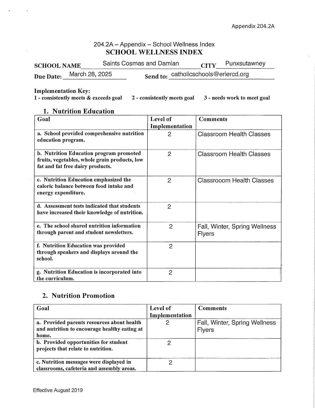 The LWC will monitor the implementation of the Student Wellness Policy, execute a plan for evaluating its effectiveness, and report to the school administrator, parents, and/or the community the status of implementing the plan. The committee will utilize the School Wellness Index and other sources of data to identify priority areas and to monitor improvements in those areas. The committee will ensure that the school provides families with information about school and community nutrition education and physical activity opportunities. The committee will report to the Diocesan Wellness Committee on an annual basis with results of the School Wellness Index.