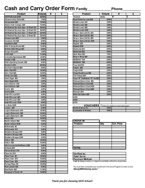 Orders can now be placed online. Print out a receipt and submit it on Monday by 9:00 am Pick up Scrip on the following Friday. Go to www.shopwithscrip.com The SSCD Scrip enrollment code is available by calling the school ofice at 814-938-4224.